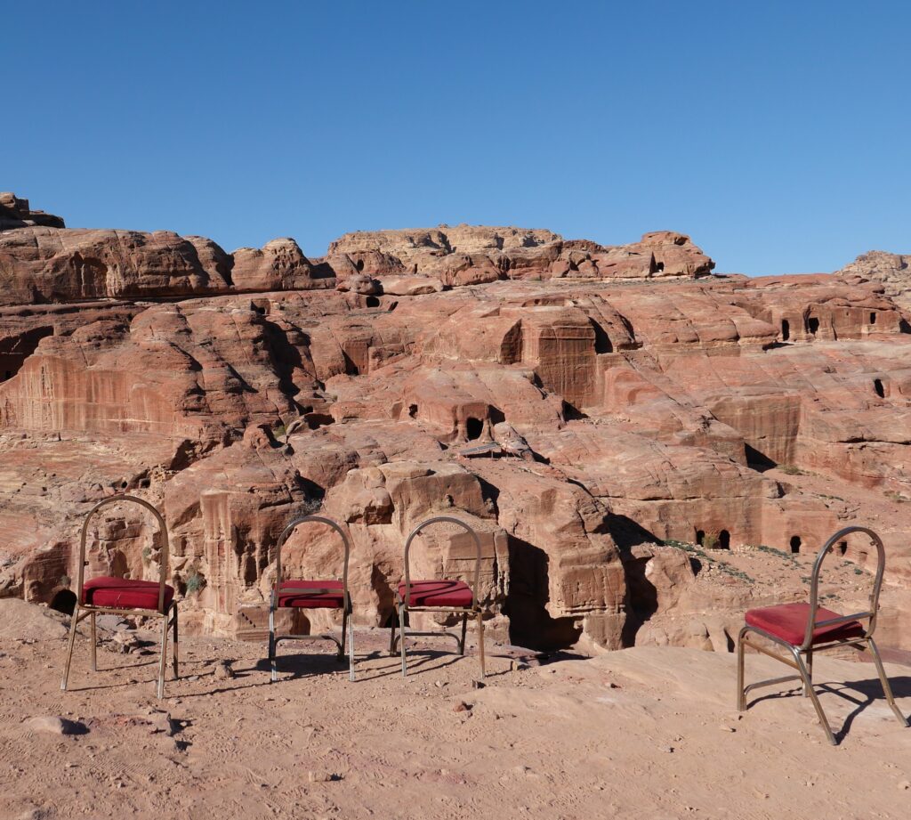 Προτείνω αμέσως  μετά το θησαυροφυλάκιο να ανέβεις τα σκαλιά πάνω από τους βασιλικούς τάφους,  έχεις καλύτερη πρώτη εικόνα του μεγέθους της πόλης. Βλέπεις τους τουρίστες και τις καμήλες να περνούν ακριβώς κάτω από τα πόδια σου. Υπάρχουν σπηλιές- καντίνες  που πωλούν νερό, καφέ και χυμό από ρόδι.