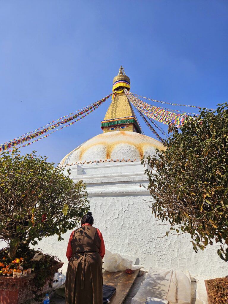 Πήγα στον ναό δύο φορές, πρωί και απόγευμα και η κίνηση ήταν διαφορετική. Το πρωί πιο ήσυχα, υπήρχαν προσφορές με λουλούδια και αναμμένα κεριά από βούτυρο γιακ. Το απόγευμα στη δύση του ήλιου η κίνηση ήταν μεγαλύτερη. Η εντυπωσιακή στούπα με τη μυστικιστική αύρα είναι ο πιο ιερός βουδιστικός τόπος προσκυνήματος με επισκέπτες και προσκυνητές από όλο τον κόσμο. Η περιήγηση και η περιφορά των προσκυνητών είναι δεξιόστροφη και ονομάζεται pradakshina, για να υπάρχει ευθυγράμμιση με τη φυσική δύναμη. Μην ξεχάσεις να επισκεφτείς τον ναό που είναι ακριβώς απέναντι από την είσοδο της στούπας. Ο καλύτερος τρόπος για να φτάσεις είναι με ταξί, η είσοδος είναι με εισιτήριο.